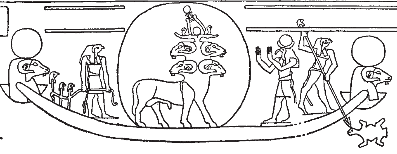- Von Lieven 2000, p. 34, n. e, did not read the location from which Khnum rises, whereas Kurth had previously suggested “Akhet.” Both authors seem to have been influenced by the typeset hieroglyphs, since in the epigraphic copy it is evident that the tall sign with dots is not ḏȝỉ, “to sail”. Rather, it is a deconstructed Eastern standard (ỉȝbt.t), here placed after its usual determinatives (arm and land sign), and the bottom pole rendered as a small rectangle. The following verb ḏȝỉ is written with the ideogram of a boat.↩︎This text suggests the daytime sun disk itself is a manifestation of the four-headed ram of Mendes. This is precisely what is depicted in Esna 437, 6, where the day bark shows the Mendesian ram, between two barks with a child (morning sun) and old ram-headed man (evening sun):