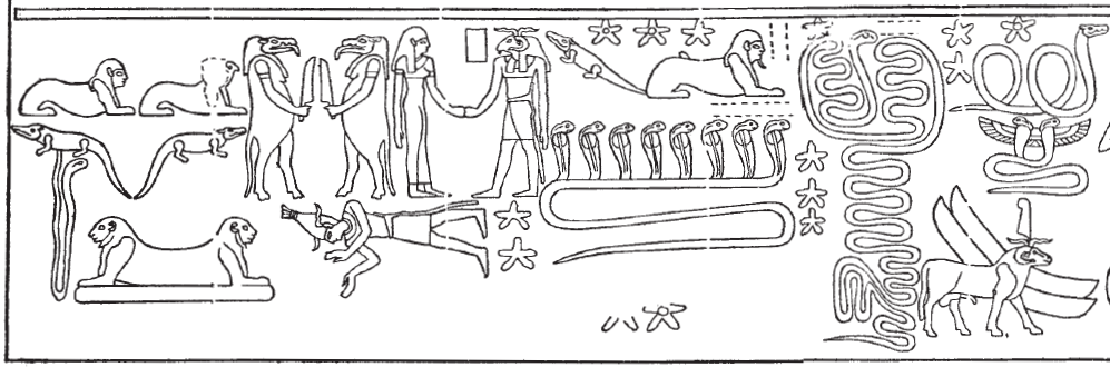 The first vertical sign is unclear (see the color photographs linked above), but this appears to be the same name attested for a seahorse-shaped serpent, which is also attested above in Esna 399, A (upper right corner): see Landgráfová 2019. The reading of that figure’s caption was discussed by Christian Leitz.↩︎