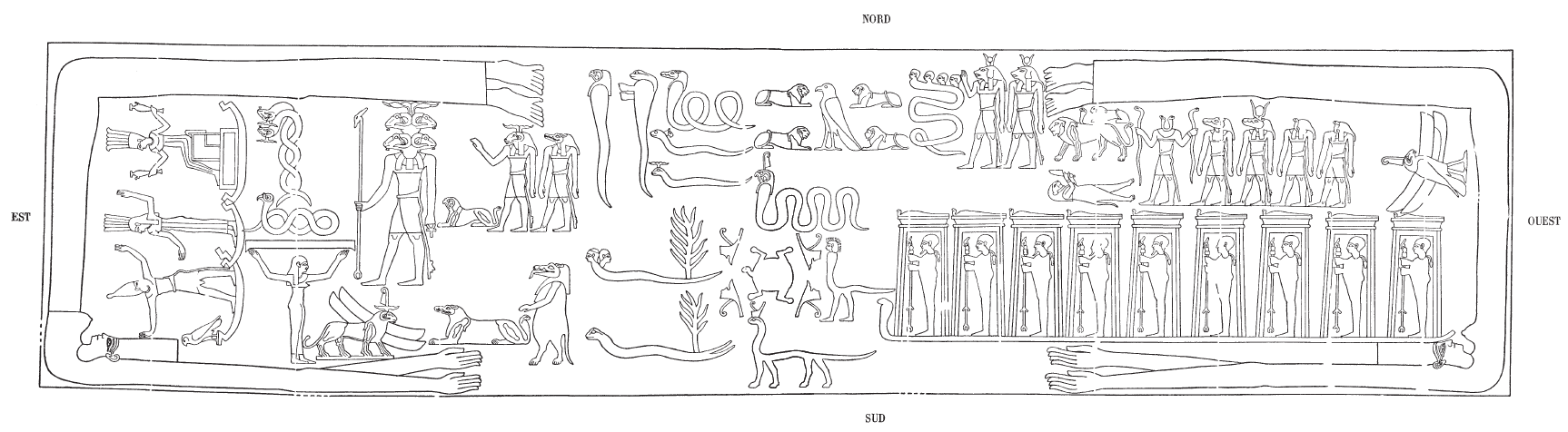 Other astral beings can be compared to depictions on other temple ceilings. New texts concerning some of the elaborate snakes (especially the snake carrying 9 different Ptahs) have recently been published from the 26th Dynasty tomb of Iufaa from Abusir: Landgráfová et al. 2017, Landgráfová, Janák 2017, Landgráfová, Janák 2021. For detailed commentary, consult the works noted in the bibliography.